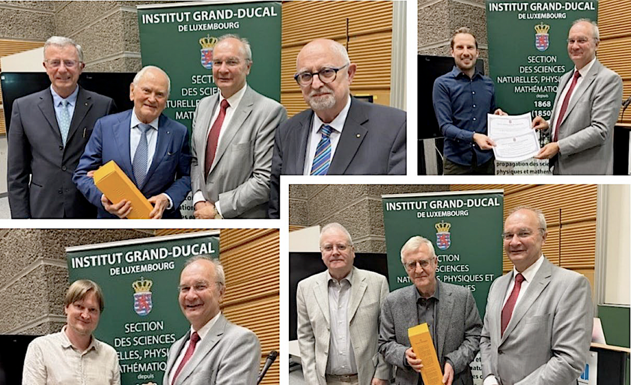 En haut à gauche : Jean-Dominique de Korvin (Président d’honneur de l’Académie Lorraine des Sciences), Pierre Seck, Lucien Hoffmann, Jean-Marie Parisi (Président de l’Académie Lorraine des Sciences). En haut à droite : Florian Kaiser, Lucien Hoffmann. En bas à gauche : Alexandre Tkatchenko, Lucien Hoffmann. En bas à droite : Claude Meisch, Jos Massard, Lucien Hoffmann.